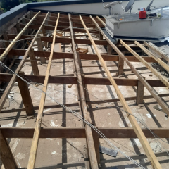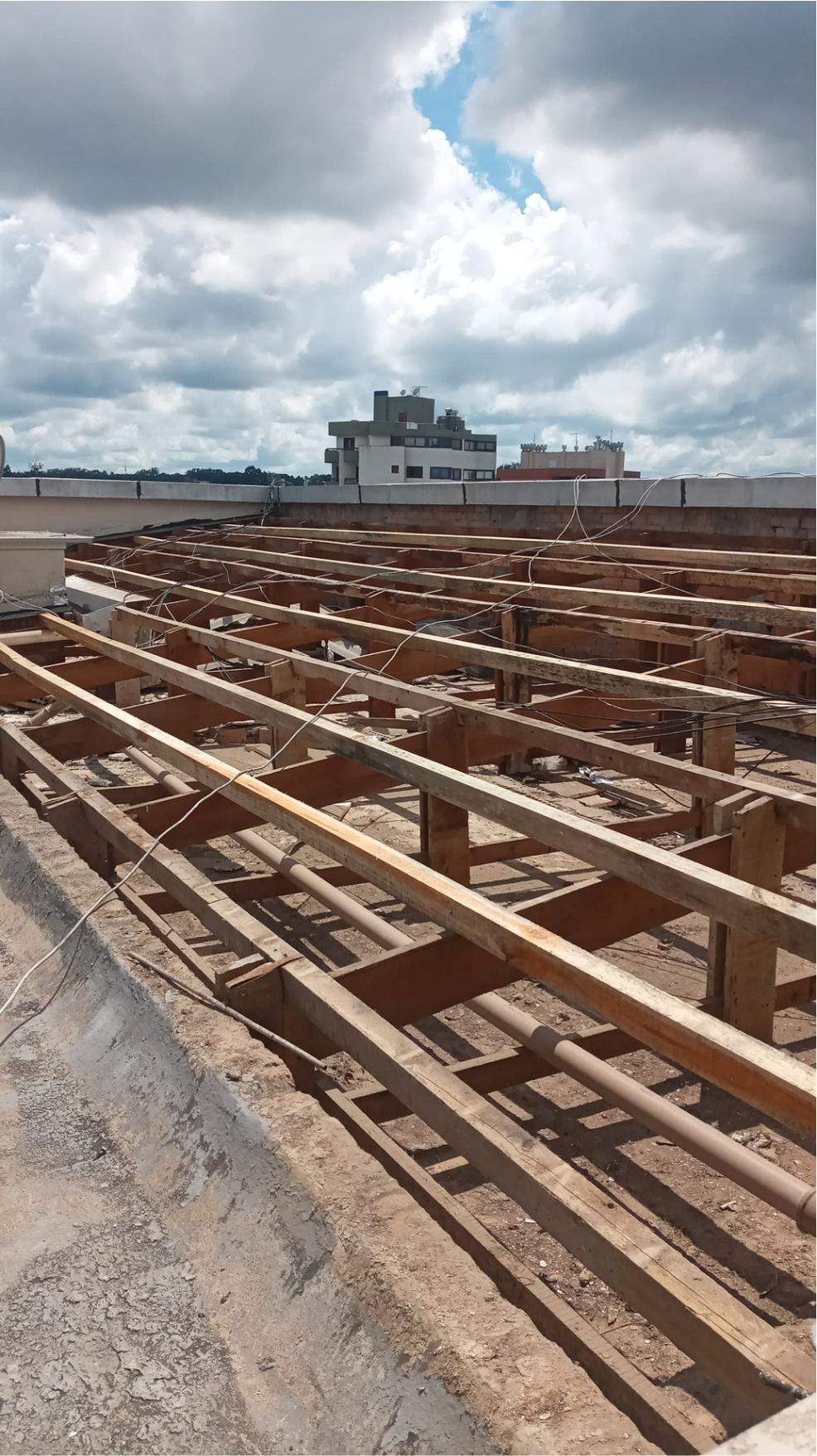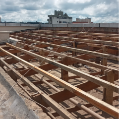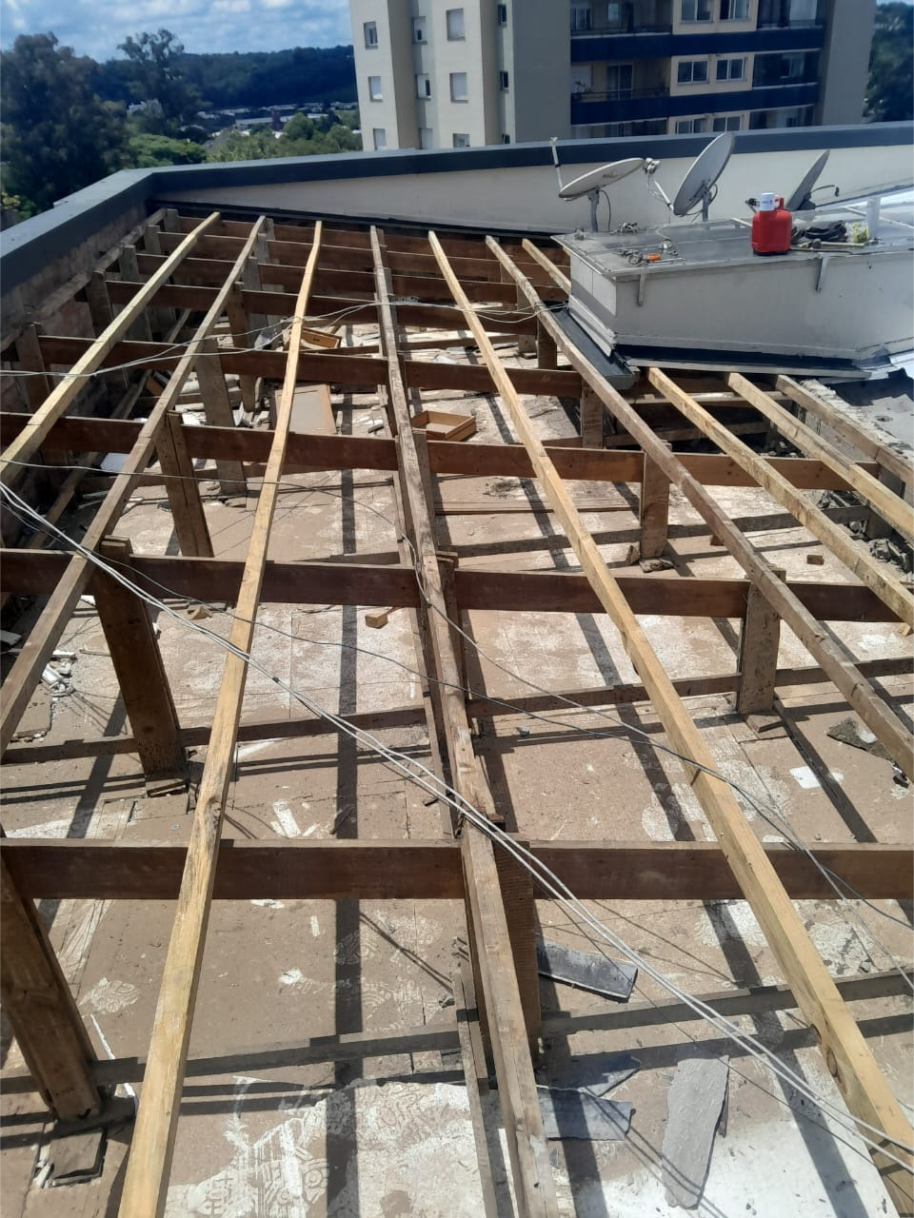 1. Remoção das telhas Brasilit regularização das madeiras retirada dos caibros podres espaçamento de 60cm para receber o aluzinco.