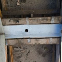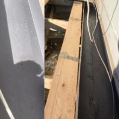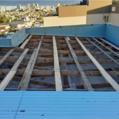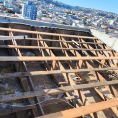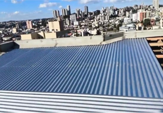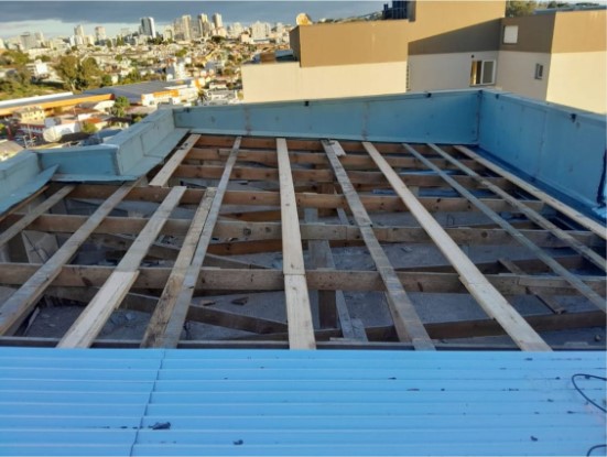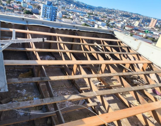 Remoção das telhas de fibrocimento (Brasilit) e regularização da estrutura de madeira, com substituição das peças deterioradas e readequação do espaçamento entre ripas em 60 cm, para receber as novas telhas de aluzinco.